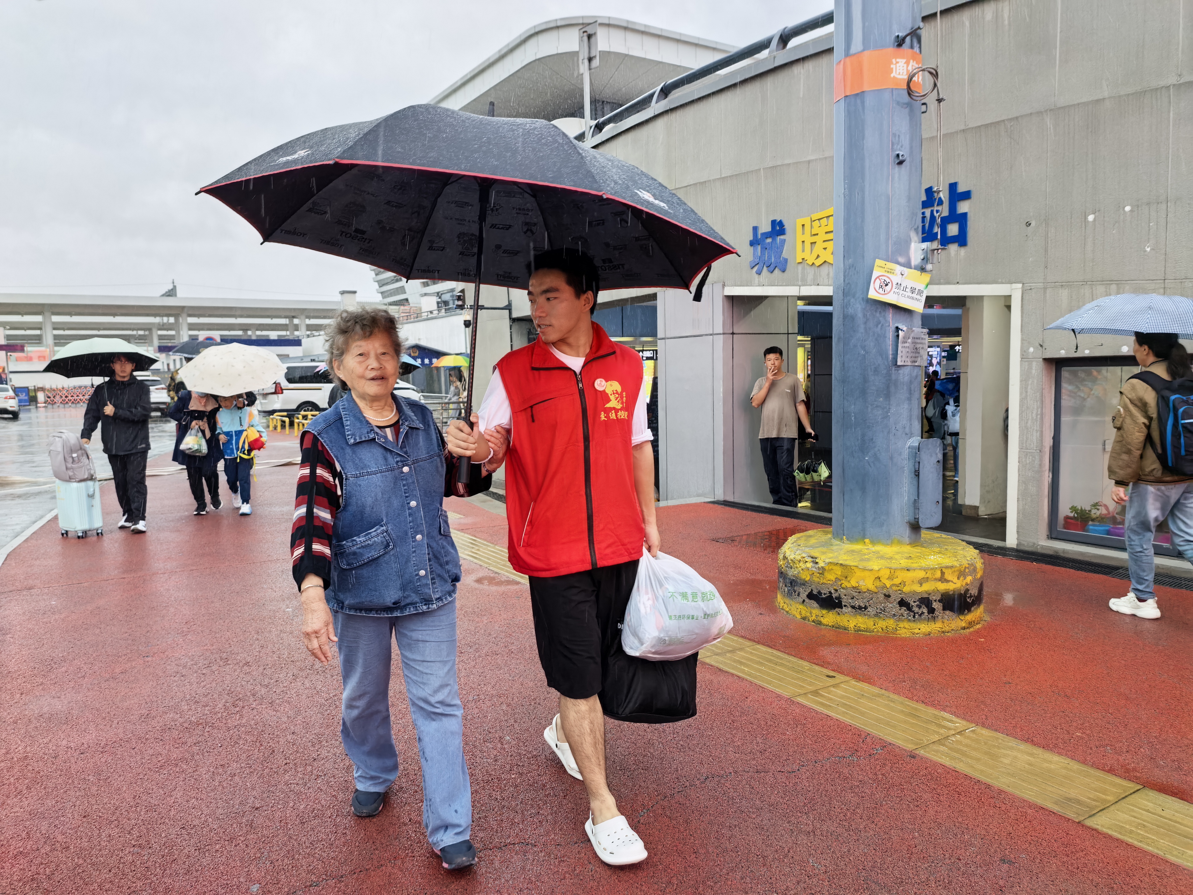 “小伙子,你鞋都濕透了,快歇歇吧!”一位提著兩大袋行李的旅客看著志愿者邵俊翔鞋子上的雨水,忍不住拉了拉他的胳膊。小邵卻笑著把行李往自己肩上又挪了挪:“沒事阿姨,你要去的公交換乘點不遠,我送您過去。”說著就打起傘快步往換乘點走去,雨水順著傘沿留下,打濕了他的衣褲,卻沒停下腳步。另一邊,志愿者們正幫助旅客搬運大件行李,用手推車將他們送到換乘點。