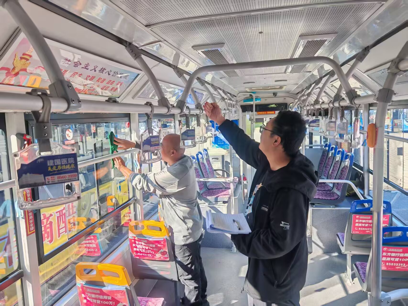 本次檢查堅(jiān)持“全面覆蓋、不留死角”的原則,重點(diǎn)核查車(chē)容車(chē)貌、車(chē)身及車(chē)窗清潔度,以及車(chē)廂內(nèi)座椅、扶手、地板等關(guān)鍵部位的衛(wèi)生狀況。檢查組還關(guān)注垃圾桶清理情況、通風(fēng)設(shè)施暢通性、車(chē)內(nèi)標(biāo)識(shí)完好度,以及扶手、投幣機(jī)等高頻接觸區(qū)域的清潔消毒是否達(dá)標(biāo)。