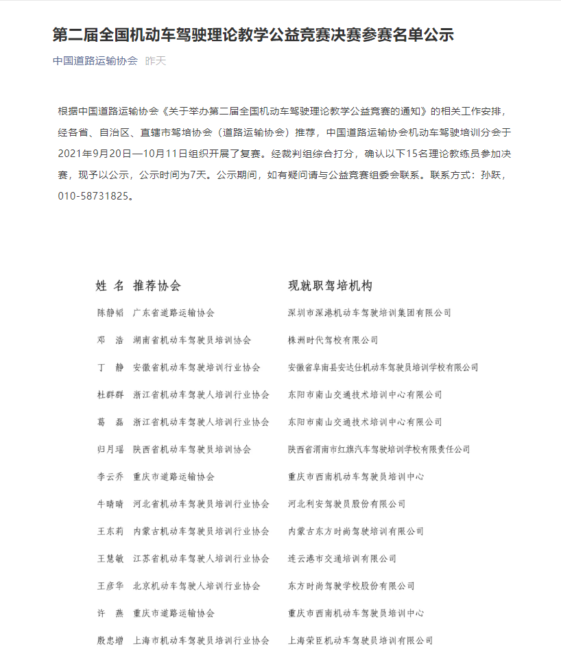 2021年8月,由交通運(yùn)輸部運(yùn)輸服務(wù)司、公安部交通管理局指導(dǎo),中國道路運(yùn)輸協(xié)會主辦,公安部道路交通安全研究中心、中國道路交通安全協(xié)會共同聯(lián)辦,中國道路運(yùn)輸協(xié)會機(jī)動車駕駛培訓(xùn)分會承辦的第二屆全國機(jī)動車駕駛理論教學(xué)公益競賽正式啟動,經(jīng)過3個月的初賽、復(fù)賽,最終15名來自全國各省市理論教員進(jìn)入11月2日在湖南長沙舉辦的總決賽。交培公司王慧敏同志通過層層比賽,最終進(jìn)入全國總決賽,同時她也是江蘇省僅此一人入圍。